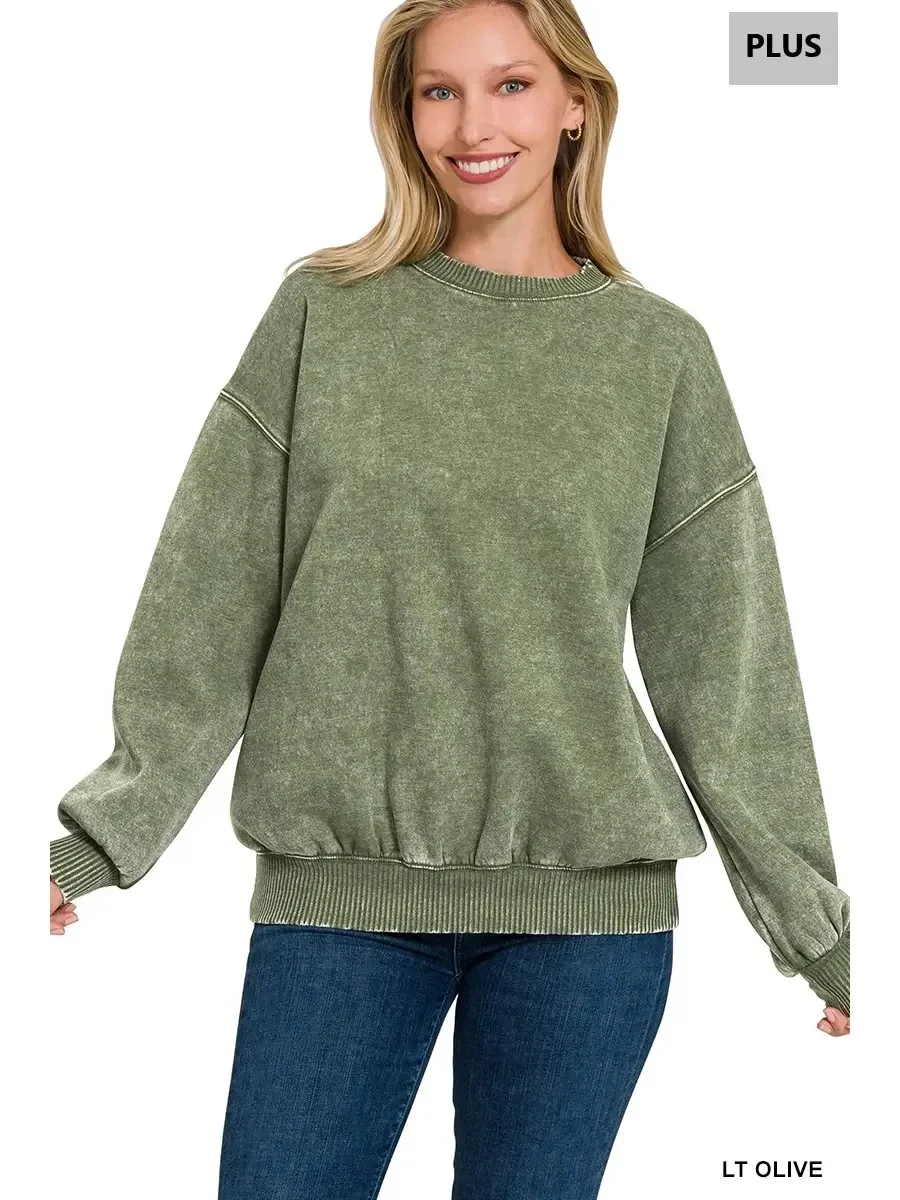 LT Olive -Plus Acid Wash Fleece Oversized Pullover
