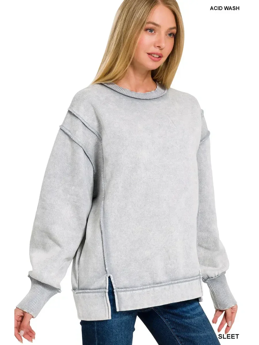 Acid Wash Exposed-seam Fleece Sweatshirt - Side Slit - Exposed Seam Details