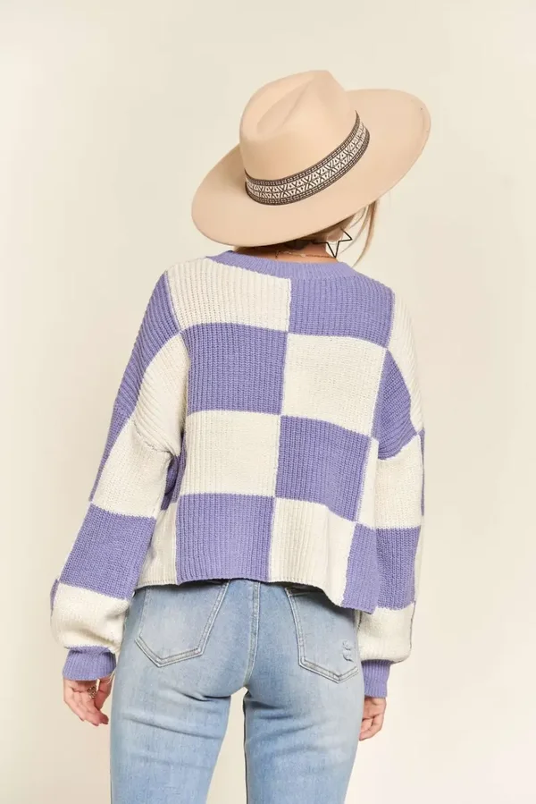 PLUS SIZE LONG SLEEVE ROUND NECK COMFY CHECKERED COLORBLOCK SWEATER TOP 50% ACRYLIC 44% COTTON 6% SPANDEX MADE IN CHINA *Plus size *Drop shoulder *Checker color block *Wide round neck *Comfy crop sweater *Casual, Daily wear