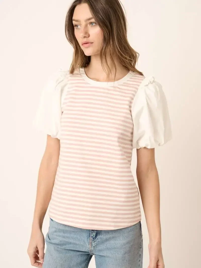Mix Media Striped Balloon Sleeve Top